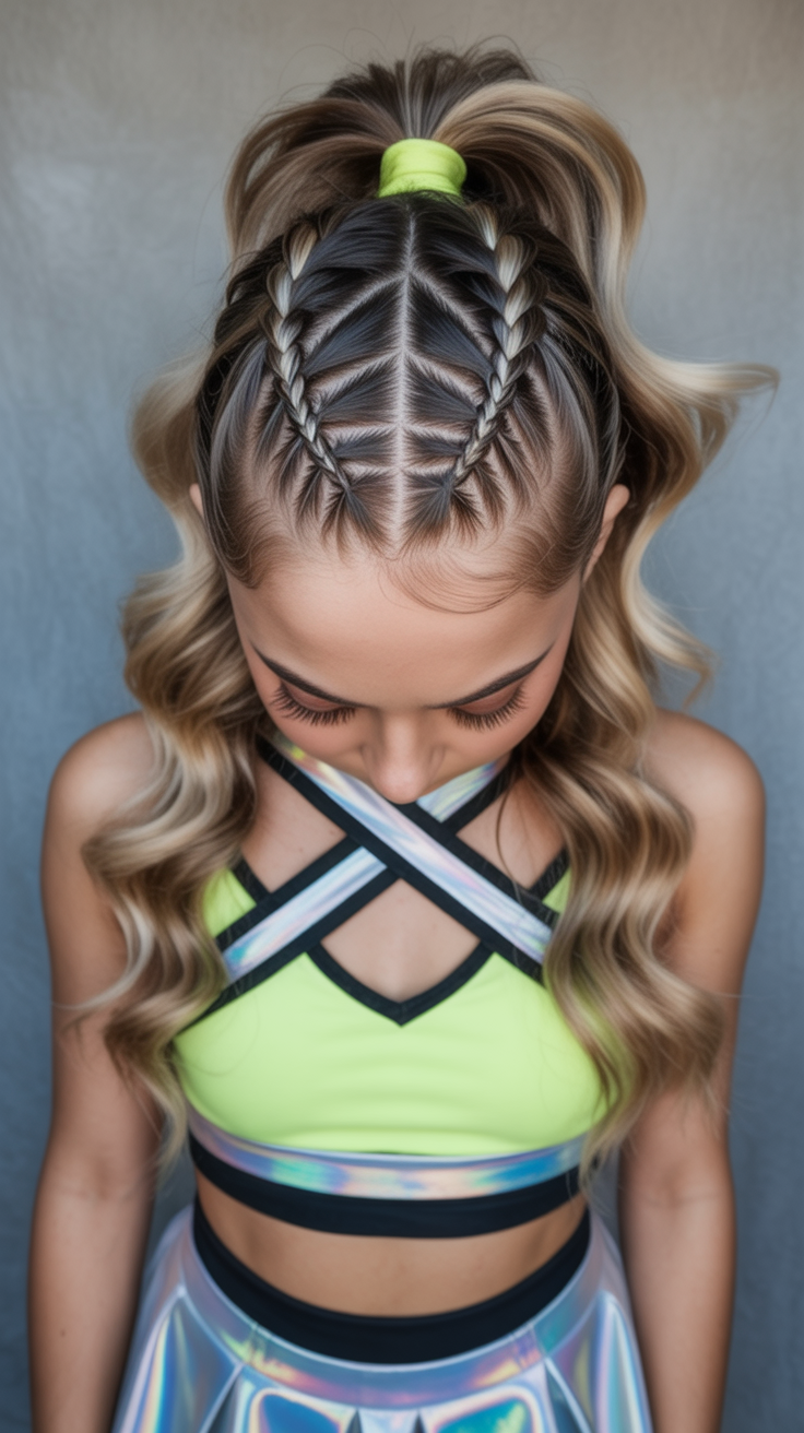 Prima-style front braids with a voluminous high ponytail topped with a neon tie make a statement. Fiercely fun, this cheer hairstyle is sure to brighten up the sidelines. The braids add a touch of edge, while the loose waves balance it with a lighthearted charm: think youthful, modern, and loads of confident energy for all those big games!