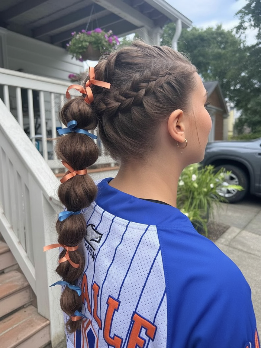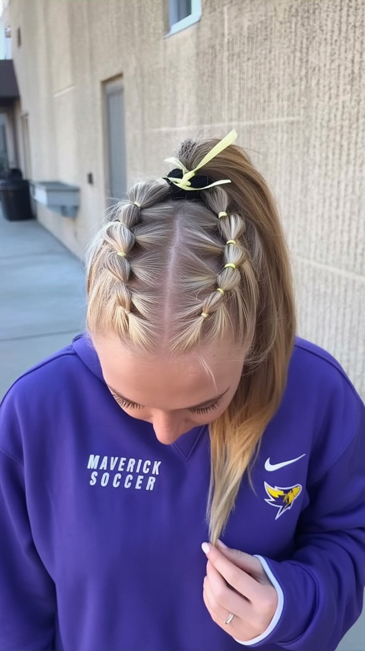 This bubble braid wrapped with colorful ribbons is full of personality — sporty, fun, and full of bounce. The different-sized sections create movement while the braids along the sides add structure. It’s equal parts playful and powerful, perfect for younger cheerleaders who still want a standout look.
