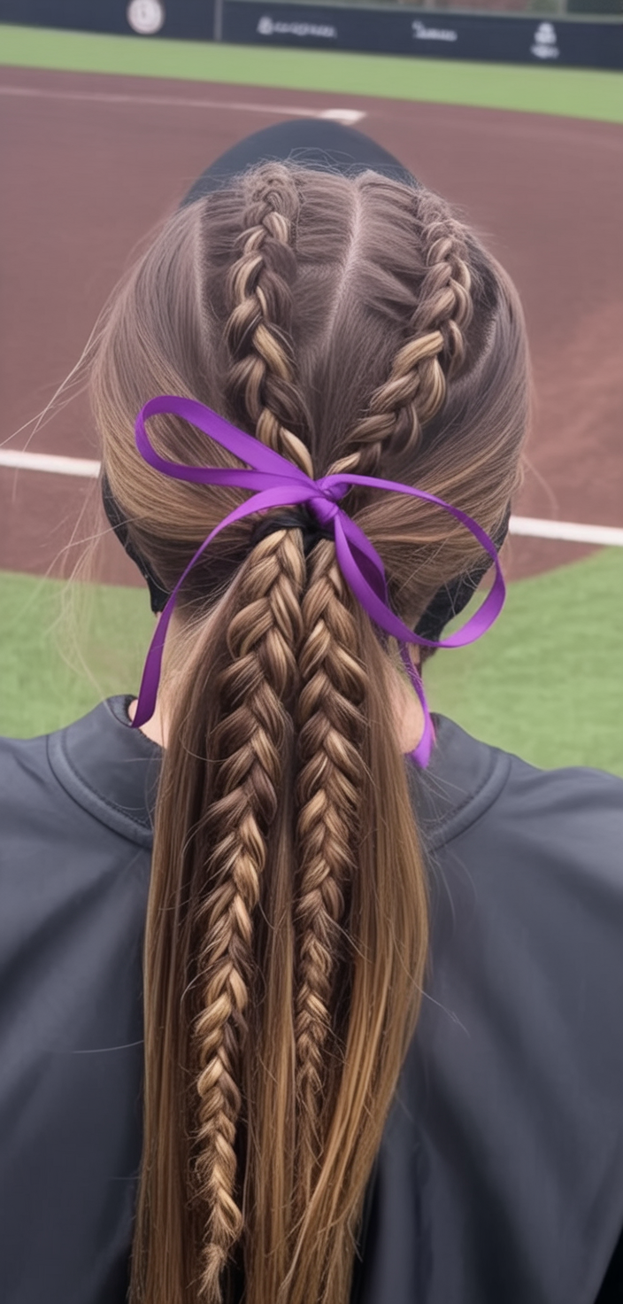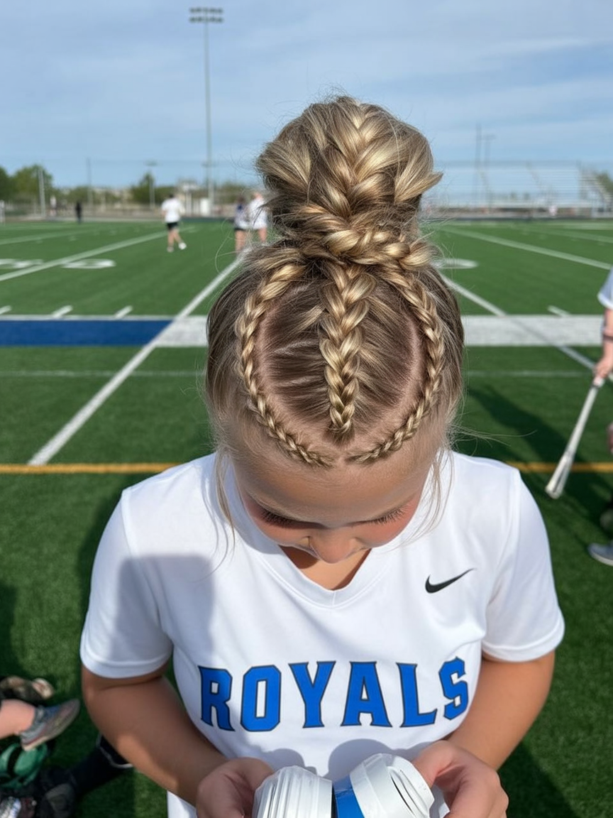 A favorite for those with long hair, this look is all the rage during football season and high-energy competitions. What is more, it is practical: the style remains intact through jumps, flips, and endless sideline chants. To keep that sleek finish on the braids, smooth down any flyaways with styling gel, and go ahead and layer on a bit of glitter spray for extra sparkle on game day.
