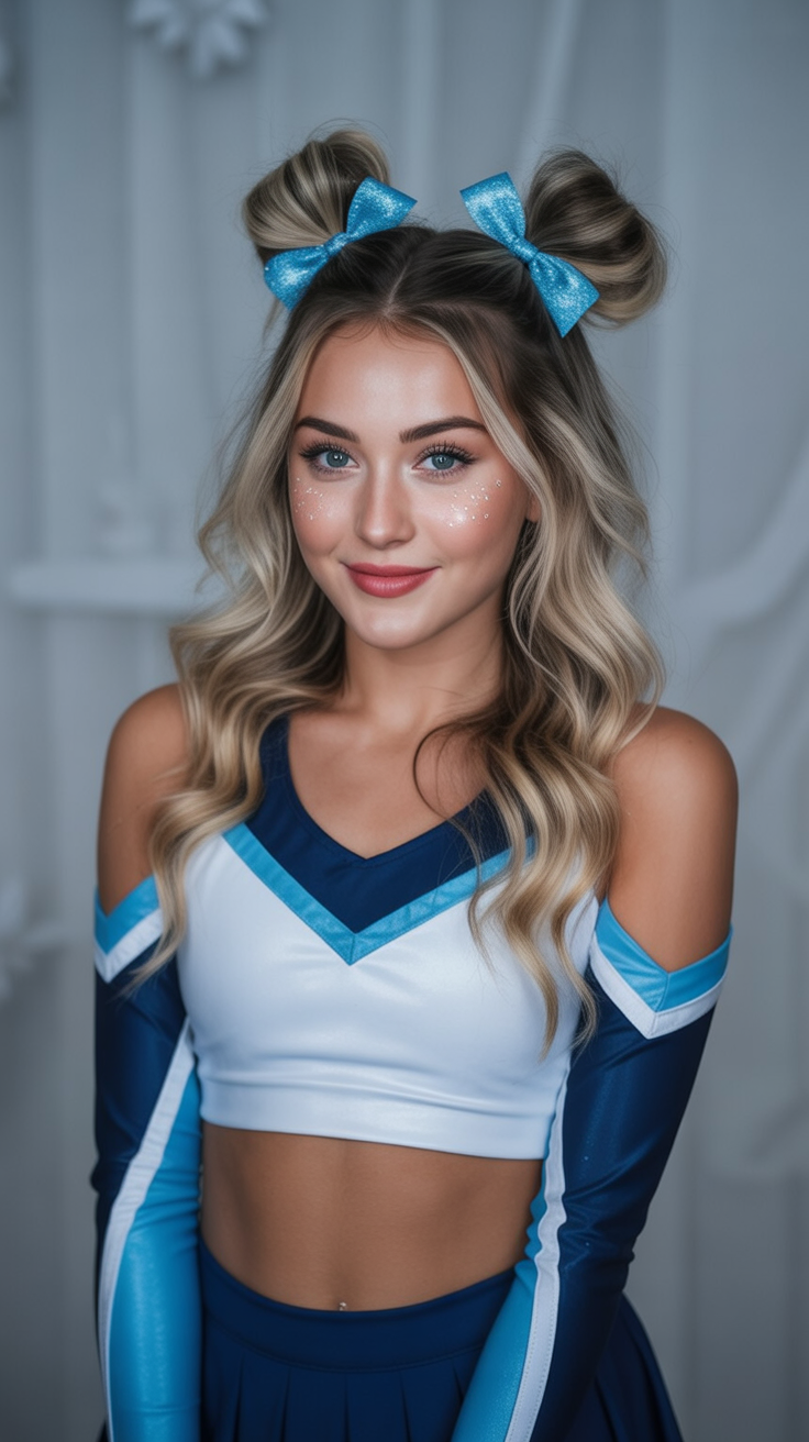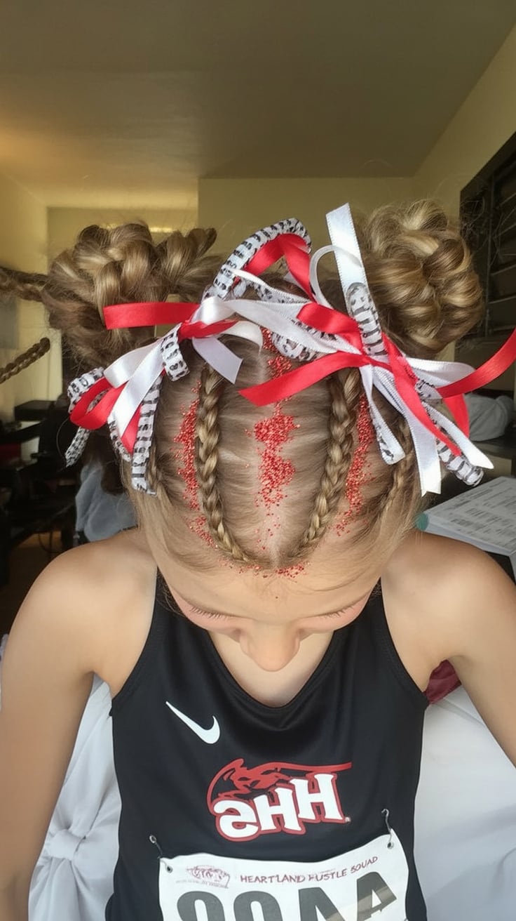 This is scream-worthy for team spirit — braided buns, glitter-dusted roots, and ribbons fluttering around all combine maximum cheer energy. It is in nature playful, loud, and hard to ignore, which makes it ideal for competitions or any type of themed events.