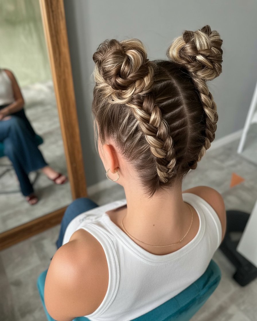 This gives the space bun a sporty update with double braids that feed into two playful knobby horns. They scream fun energy while keeping hair off the face, suitable for serious cheer practice or competition. The style feels refreshingly now, a little edgy, and definitely unforgettable.