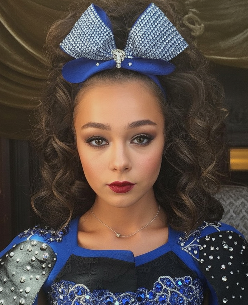 There is an old-world charm to this look — big, bold curls kissed by a shimmering headband bow that gorgeously frames the face. It is sweet and strong, fused with classic cheer energy and pageant-style polish. The rich textures make it a perfect candidate for photos and spotlights.