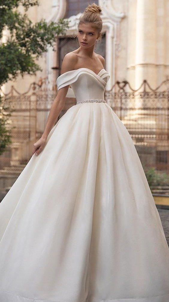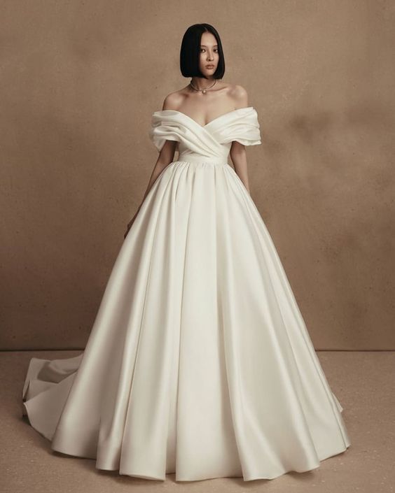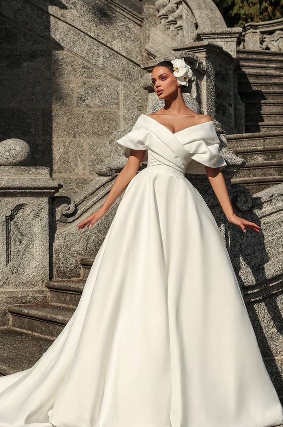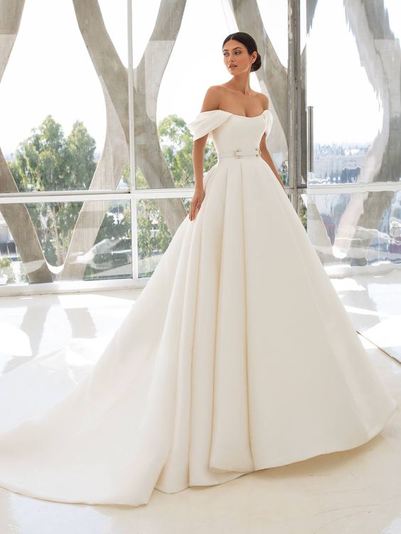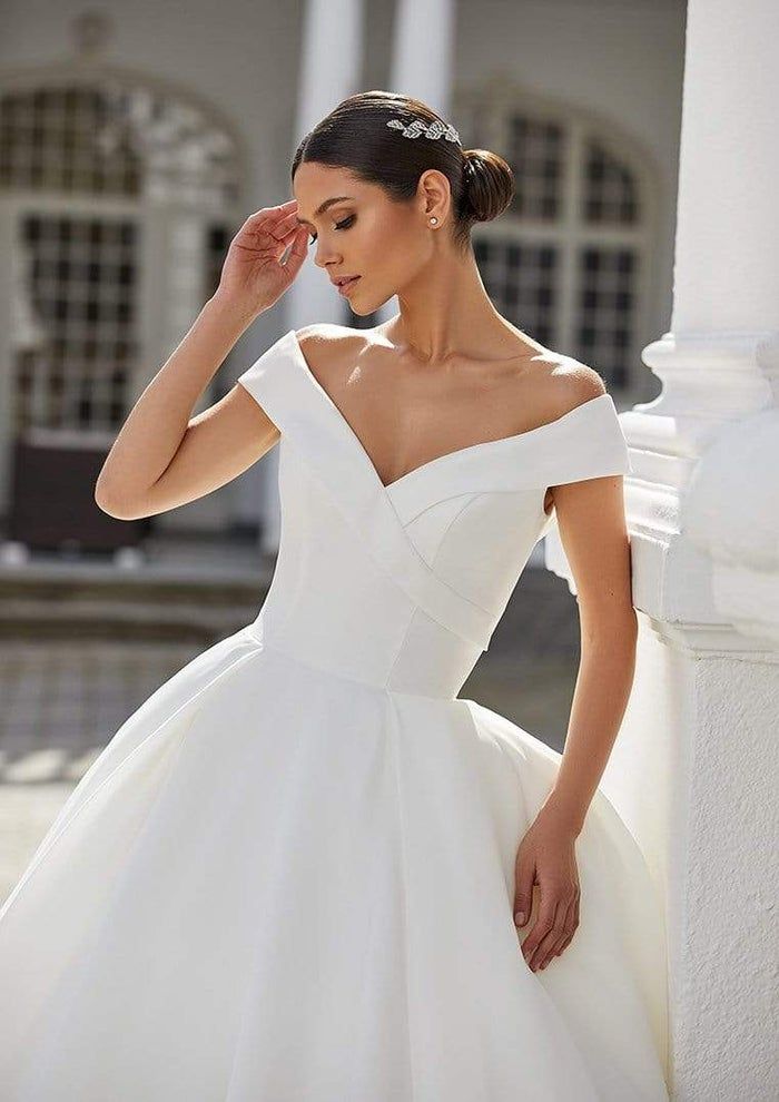 Boldness meets beauty in this breathtaking design. The off-shoulder cut combines with a snug bodice and an expansive skirt, creating a striking silhouette that commands attention. The simplicity of the fabric is a canvas for the bride’s natural elegance, making it a bold and beautiful choice for the big day.