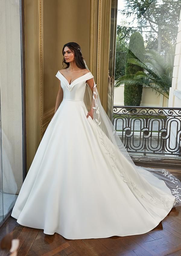 In a sea of detail, there’s a serene beauty in minimalism. This gown’s sleek design and elegant off-shoulder sleeves embody a minimalist approach to the Cinderella aesthetic. It’s a dress that proves sometimes less is indeed more, perfect for the bride with a penchant for understated style.