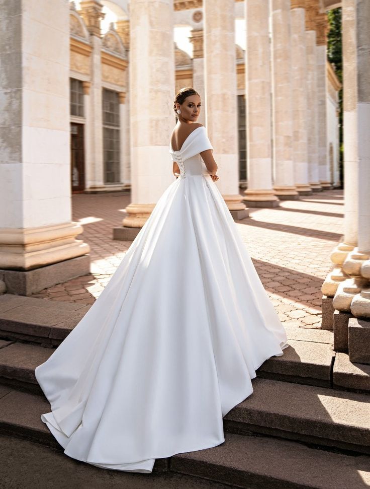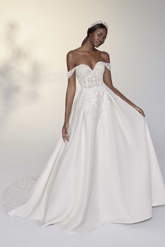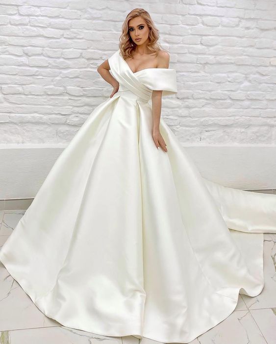 Modern elegance is redefined in this next gown. The unique off-shoulder design and the expansive satin skirt demonstrate a harmonious blend of trend and tradition, suitable for the bride who stands at the forefront of contemporary bridal fashion.