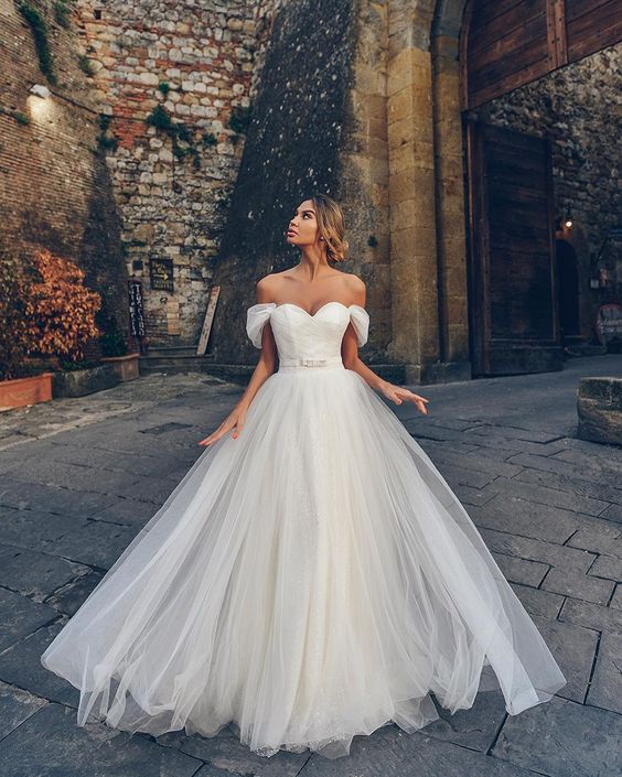 Hidden within the seams of the first gown is an ethereal beauty that speaks to the heart of tradition. This Cinderella dress encapsulates the dream of a once-in-a-lifetime fairytale wedding. The off-shoulder neckline dips gently across the décolletage, while the smooth satin ball gown skirt cascades in a symphony of simplicity and grace. It is a testament to timeless style, a piece that whispers tales of everlasting love.