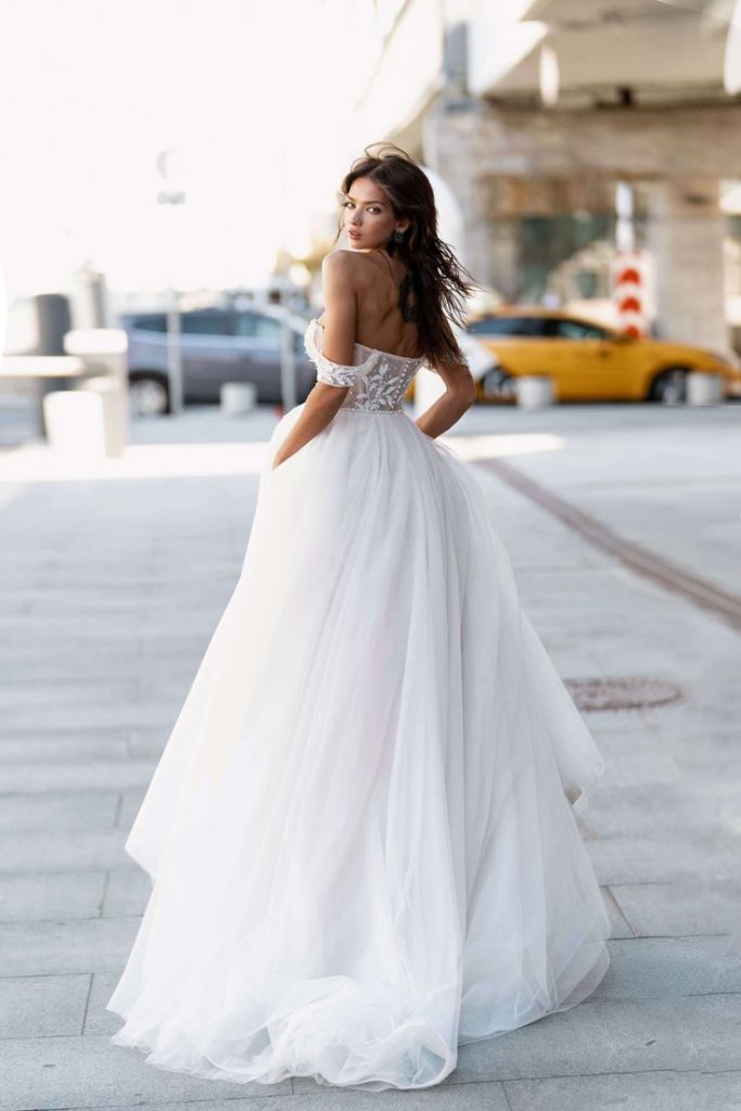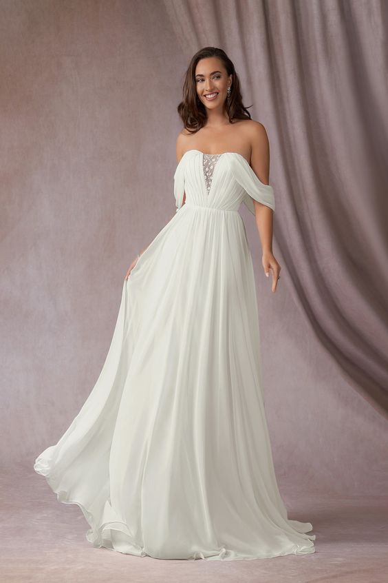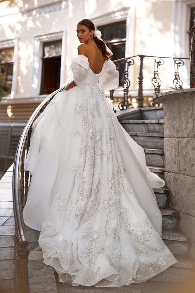 Beneath a veil of stardust, the next gown sparkles with a sophisticated charm. The off-shoulder neckline is framed by a flattering bodice that transitions into a shimmering, star-like patterned skirt. It’s a celestial celebration in a dress, ideal for the bride who wants to add a sprinkle of cosmic allure to her fairytale moment.