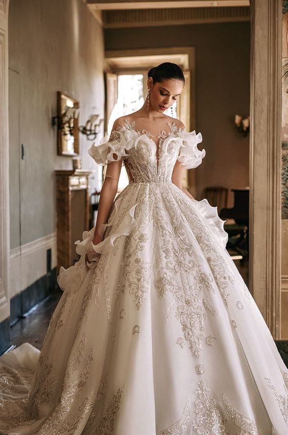 Lace has always whispered luxury, and in this exquisite creation, it roars. This gown boasts a bodice festooned with delicate lacework that trails into a full skirt, the very image of opulence. It’s a dress that doesn’t just say you’re a bride; it announces that you are queen for the day.