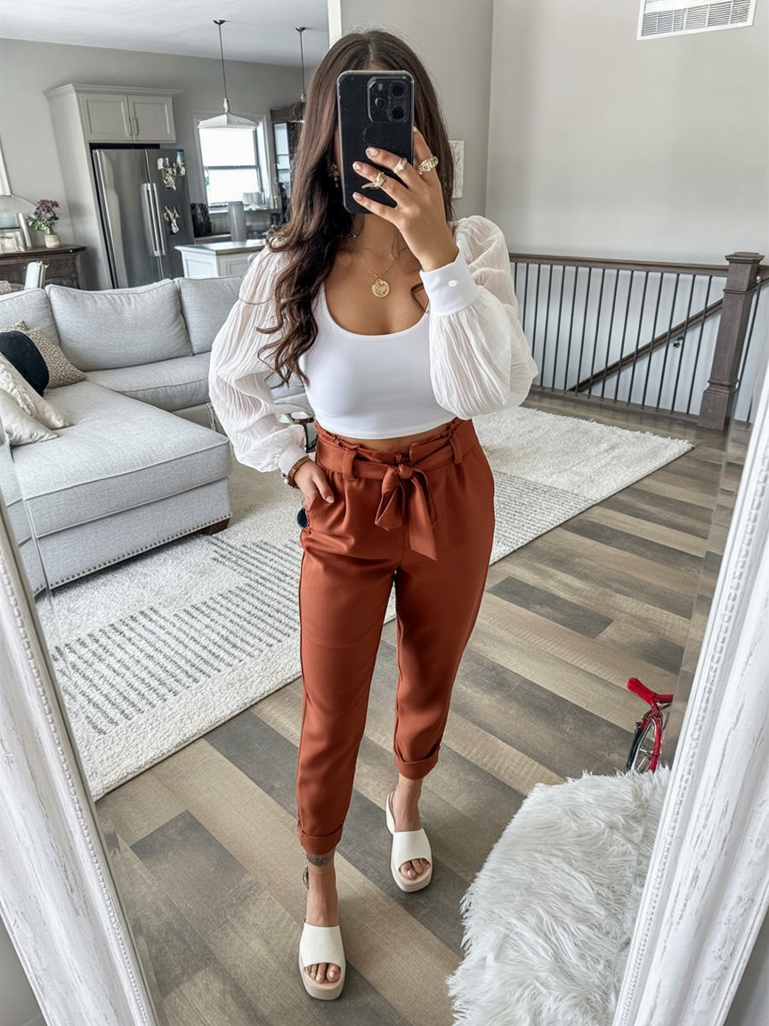 This look lands in the sweet spot of casual and polished. The white top is airy and feminine in contrast to the rust-colored pants that bring warmth and structure. It’s the kind of outfit that is just as at home over brunch as it is in a casual work meeting. There’s an ease here that is so now, so confident, so wearable.”