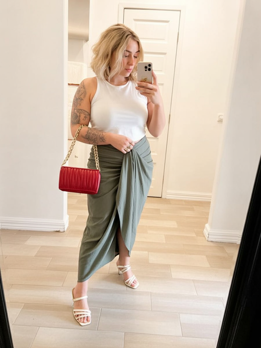 This outfit is subtly bold with clean lines, a dose of drama, and just the right amount of edge. The tailored white top keeps it neat, while the green skirt is interesting and in motion. It’s the sort of gaze that feels purposeful without shouting, ideal for women who like uplifted with a twist.