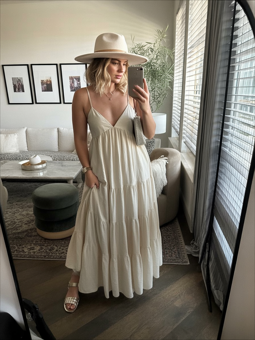 4. Creamy Tiered Dress with a Modern Boho Feel