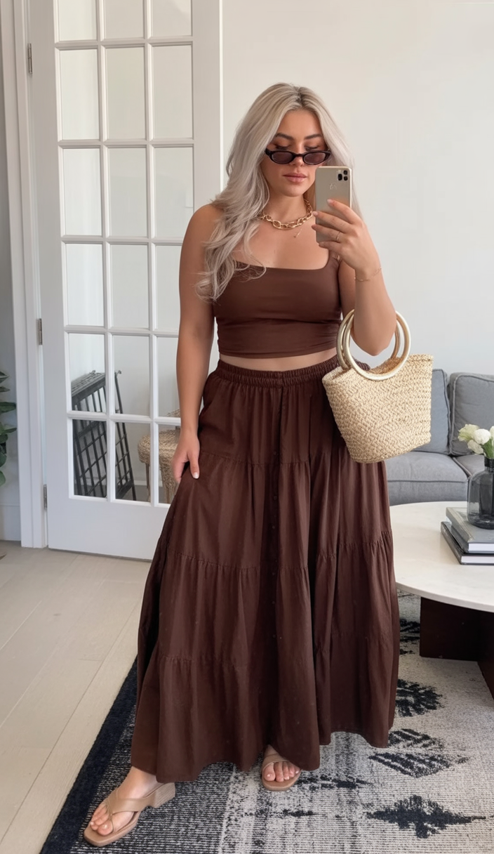 There is something quietly powerful about a head-to-toe brown moment in spring. This look seems down-to-earth, confident, and a little bit sexy in that understated but trying-not-to-try way. The flowy skirt and fitted top set is just the right tempo for walking around, but it also fizzes with effortlessness—in that plucked-together-outfit way that makes you feel as if at least one thing is going your way. It’s casual, but it still looks like a chic coffee date in the city vibe that seems very 2026.