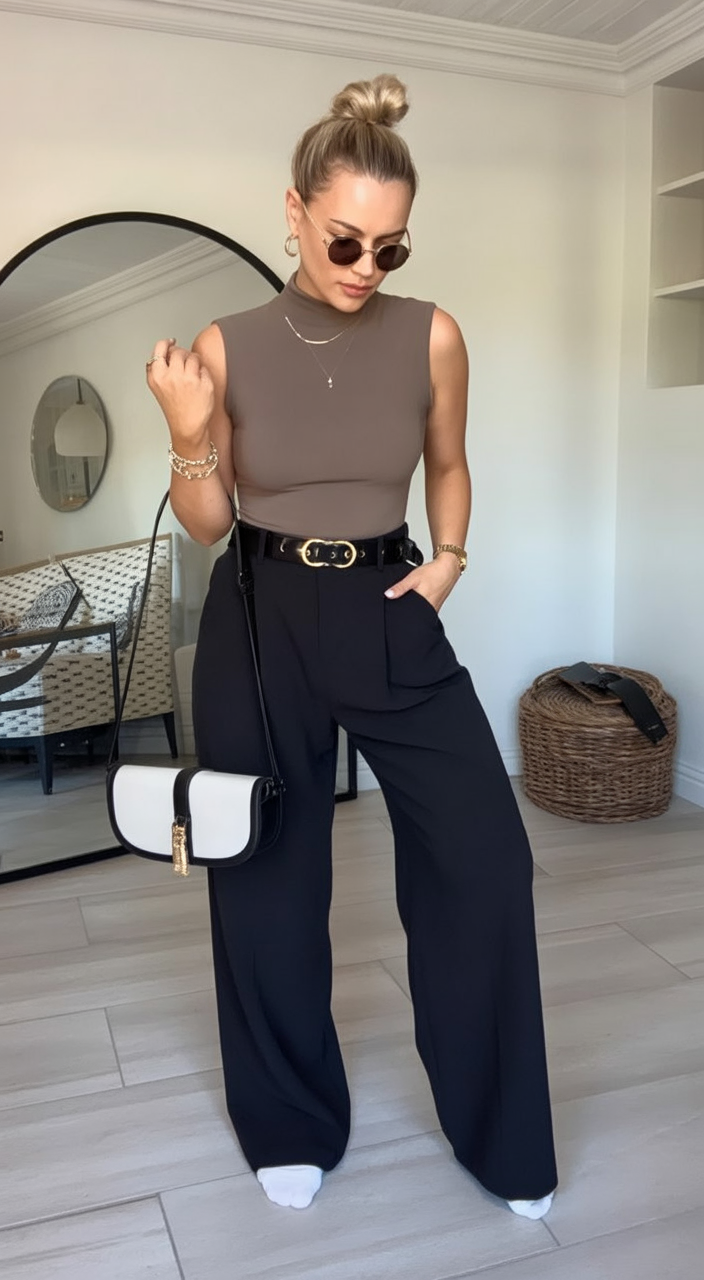 12. Taupe Sleeveless Top with Tailored Black Trousers