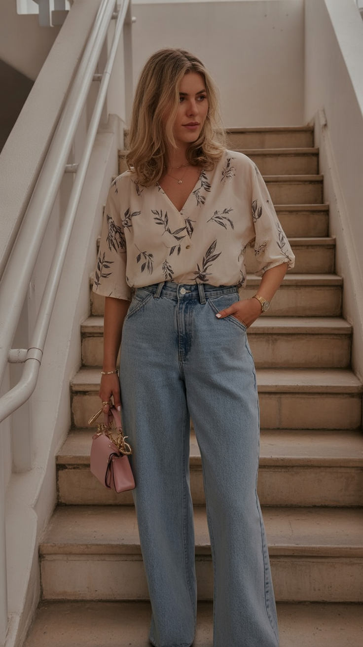 16. Printed Blouse with Relaxed Straight-Leg Jeans