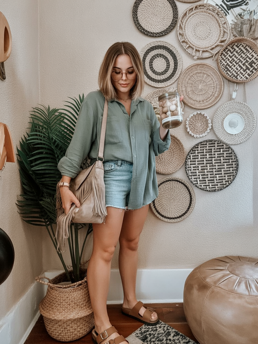 To me, this feels chill and warm and quietly stylish—kind of like a lazy spring afternoon at home or a casual coffee run that accidentally turns into an afternoon-long walk. A muted green shirt says peace and quiet energy, and then a pair of denim shorts hangs around the shoulder to remind them that you’re still young and approachable.