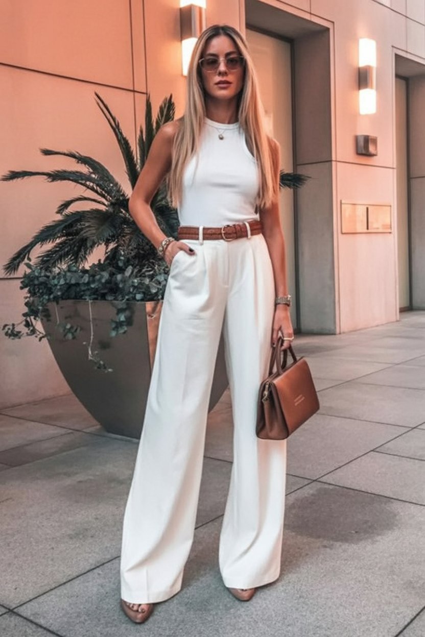 19. White Sleeveless Top with Wide-Leg Cream Trousers