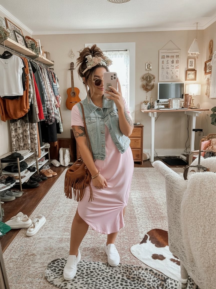 This is a playful, creative look full of personality. The soft pink dress is sweetness, and the denim vest is just enough structure and edge. It’s a cool mash-up that reads as very inspo-worthy, without feeling impractical.