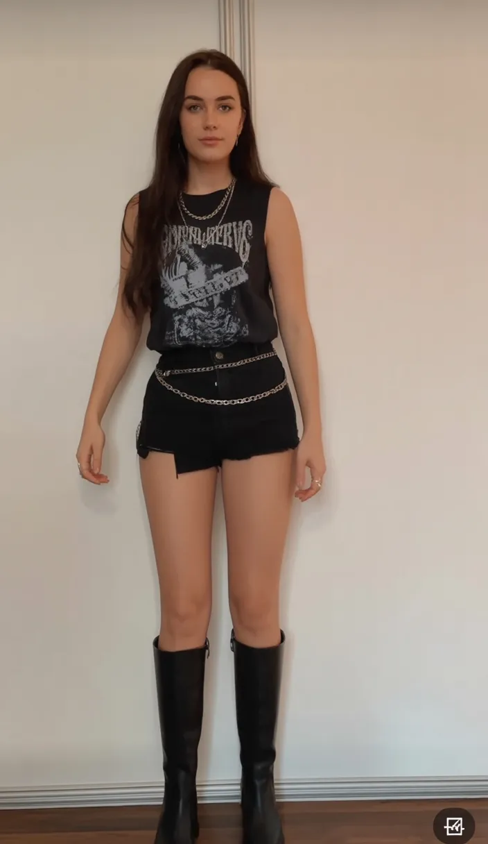 Now this one has attitude in the best possible way. The faded band tee, distressed denim shorts, tall socks, and heavy boots create that cool-girl mix of grunge and Y2K that somehow always comes back looking better. It’s not trying to be sweet, and that’s exactly why it works. There’s a little Early 2000s energy here, a little Goth influence, and just enough edge to feel memorable without becoming costume-y. This is the outfit for the woman who likes her nightlife style with a bit of bite, the kind of look that feels right at home in a live music space, an underground set, or a more alternative Women nightclub scene.