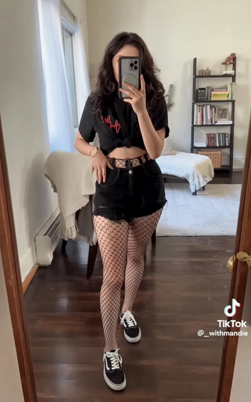 This outfit has that playful, slightly rebellious vibe that always comes back around when Y2K and Early 2000s references start trending again. A tied graphic tee, a tiny black denim mini, and fishnets underneath create that effortless “last-minute but somehow perfect” energy that works for dive bars, concerts, and low-key club nights. It feels young without trying too hard, and that is exactly why it works. There’s a little bit of 2000s attitude here, a little bit of for-women-only night-out baddie confidence, and a whole lot of personality. It’s flirty, a little cheeky, and very easy to make your own.