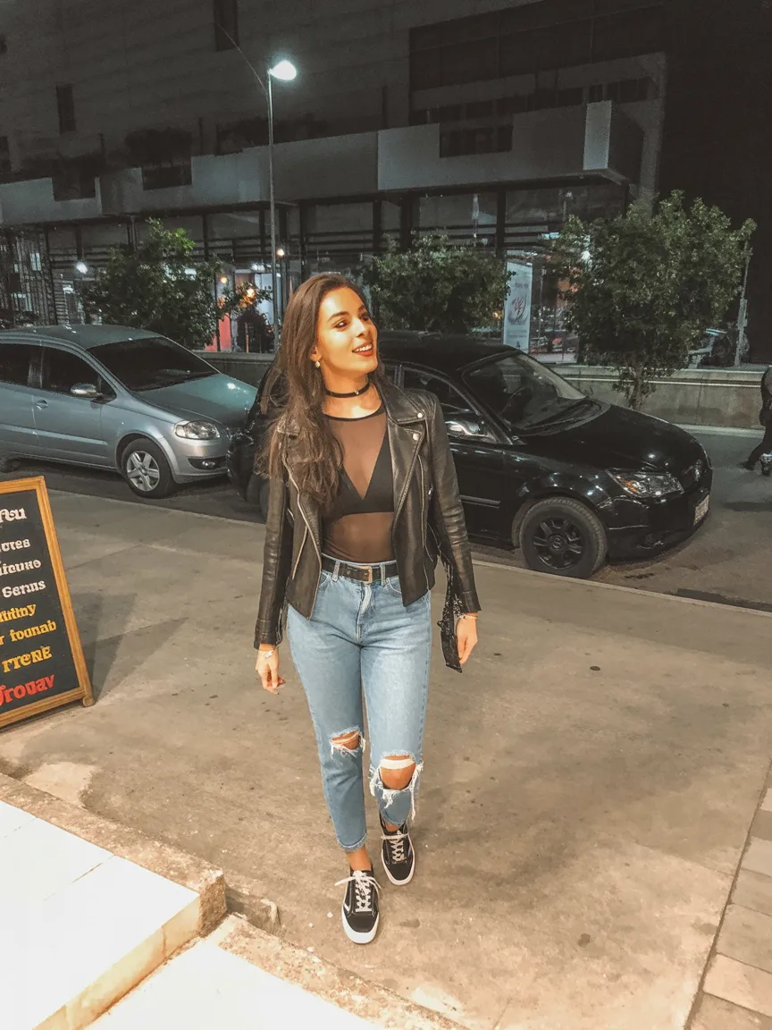 14. Sheer Bodysuit, Biker Jacket, and Ripped Jeans