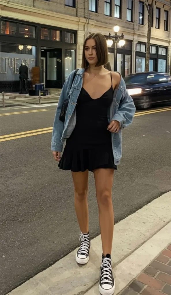 This is one of those outfits that always makes me think, “See? You really don’t need much.” A simple black slip-style mini with an oversized denim jacket and classic sneakers feels easy, cool, and just a little nostalgic in the best possible way. It has that laid-back 2010s-meets-2000s mix that never fully disappears because it just works. The dress keeps things feminine, the jacket adds attitude, and the sneakers make it feel like the kind of look you can actually live in for a full night. It’s relaxed, attractive, and quietly confident without looking too done.