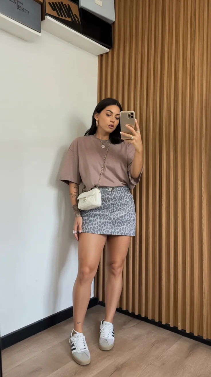 This outfit has that easy confidence I always love on a night out, especially when you want to look cute without looking like you spent two hours getting there. The oversized tee softens the whole look, while the leopard mini adds just enough attitude to make it playful. It feels casual, current, and a little cheeky, like something you’d wear for drinks that turn into dancing. There’s a hint of 2010s street-style nostalgia in the silhouette, but the overall vibe still works beautifully for club outfits in 2026 because it feels real, wearable, and full of personality rather than overly styled.
