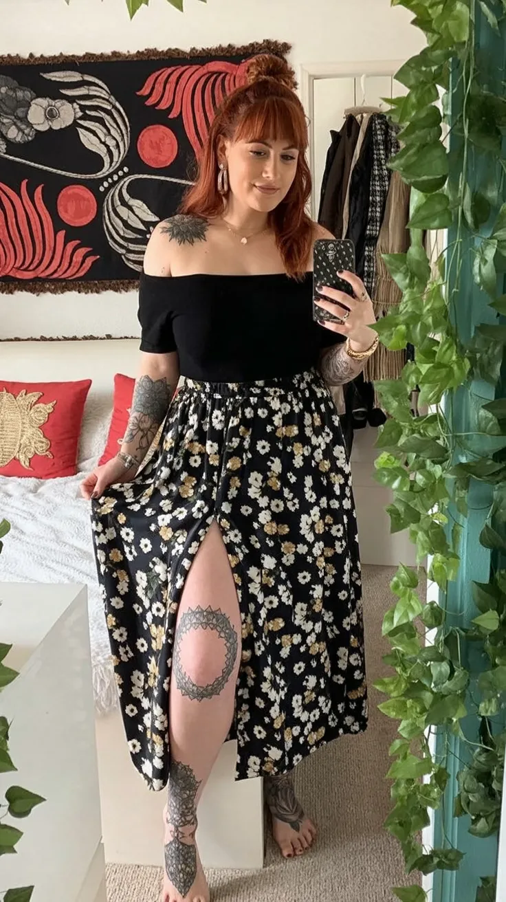 This outfit feels soft, romantic, and just a little earthy, like the kind of look you’d wear when you want your night-out style to feel feminine without being predictable. The off-shoulder black top keeps the neckline open and flattering, while the floral skirt with that dramatic slit adds movement and a touch of quiet drama. It doesn’t read like a typical club outfit at first glance, and that’s part of its charm. There’s a subtle Beach-meets-Boho energy here, but styled in black, it becomes much more evening-friendly. The whole mood feels warm, expressive, and beautifully individual.