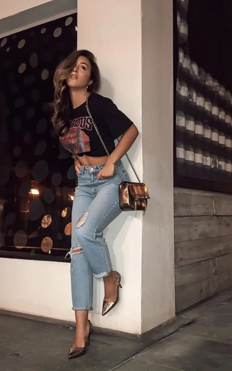 This outfit feels like the woman who always looks amazing without ever seeming stressed about it. A cropped graphic tee with ripped jeans is already a classic casual formula, but the metallic pointed heels and small chain bag lift it into true night-out territory. That contrast is what makes it so good. It has a little 2000s flash, a little modern polish, and enough personality to work for dinner, drinks, or a club with a more relaxed dress code. It’s playful, flattering, and just dressed up enough to feel special without sacrificing that easy confidence denim brings.
