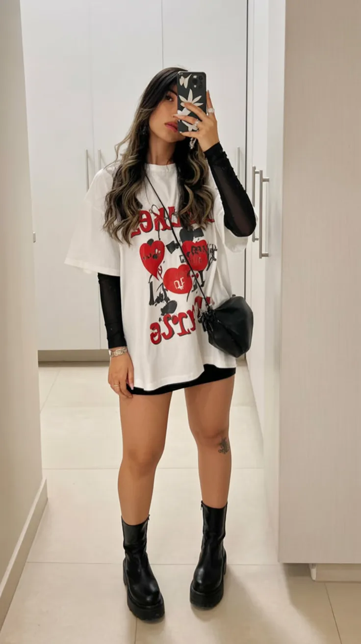 This look has such an effortless “I didn’t try too hard, but I still look amazing” charm. The oversized graphic tee tucked into a glossy black mini feels playful, slightly edgy, and very wearable. It doesn’t lean too sweet or too serious, which is exactly why it has that cool-girl staying power. There’s a little downtown energy here, a little concert-night attitude, and a hint of Women nightclub style without going full glam. The chunky boots seal the whole thing with that grounded, modern finish that makes the outfit feel fresh instead of overly sexy.