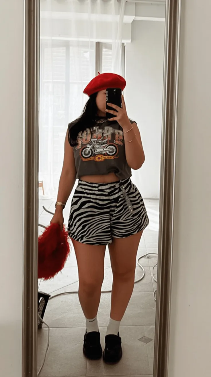 This is one of those outfits that instantly makes you smile because it has so much personality. The graphic crop top and zebra-print shorts already bring the fun, but that red beret takes the whole thing into full fashion-girl territory. It feels playful, bold, and a little unexpected, which is exactly what makes it stand out in a sea of basic black clubwear. There’s a touch of Gacha styling energy in the accessories, a little Winx-level confidence in the color pop, and a strong “I dress for my own joy” mood that feels refreshing. It’s spirited, expressive, and impossible to forget.