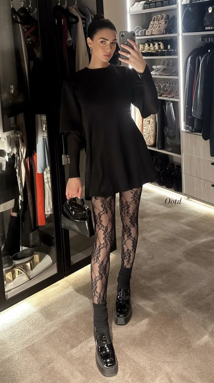 There’s something so satisfying about a little black dress that doesn’t scream for attention and still completely owns the room. This look has that polished, almost whispered confidence that feels very 2026: clean lines up top, a flirty hem, and lace-pattern tights that bring in just enough Goth energy to make the whole outfit feel memorable instead of basic. It gives that “I know exactly who I am” mood, which honestly is half the magic of a great club look. The mini bag and chunky shoes keep it from feeling too precious, so the overall effect lands somewhere between Classy and cool-girl mysterious.