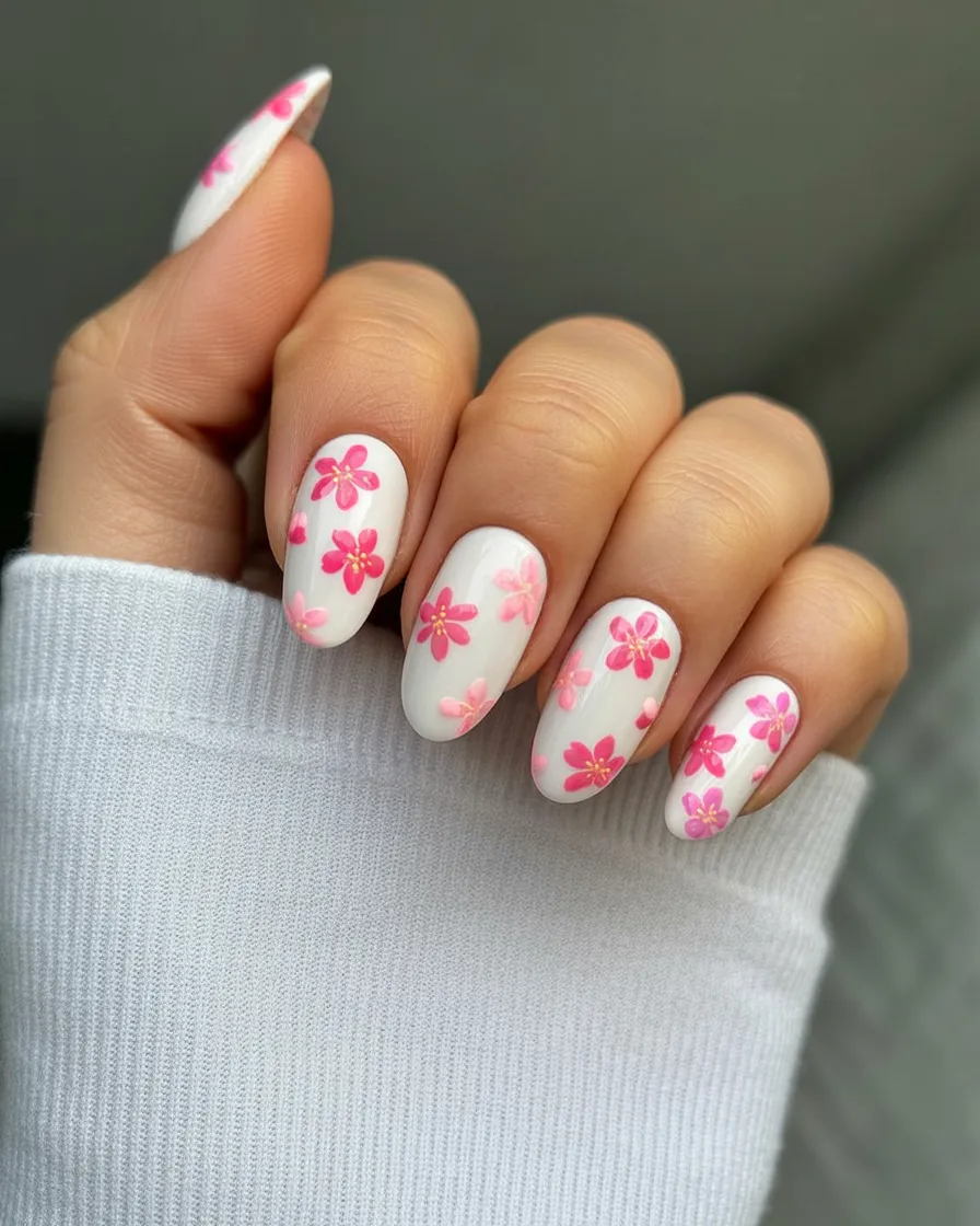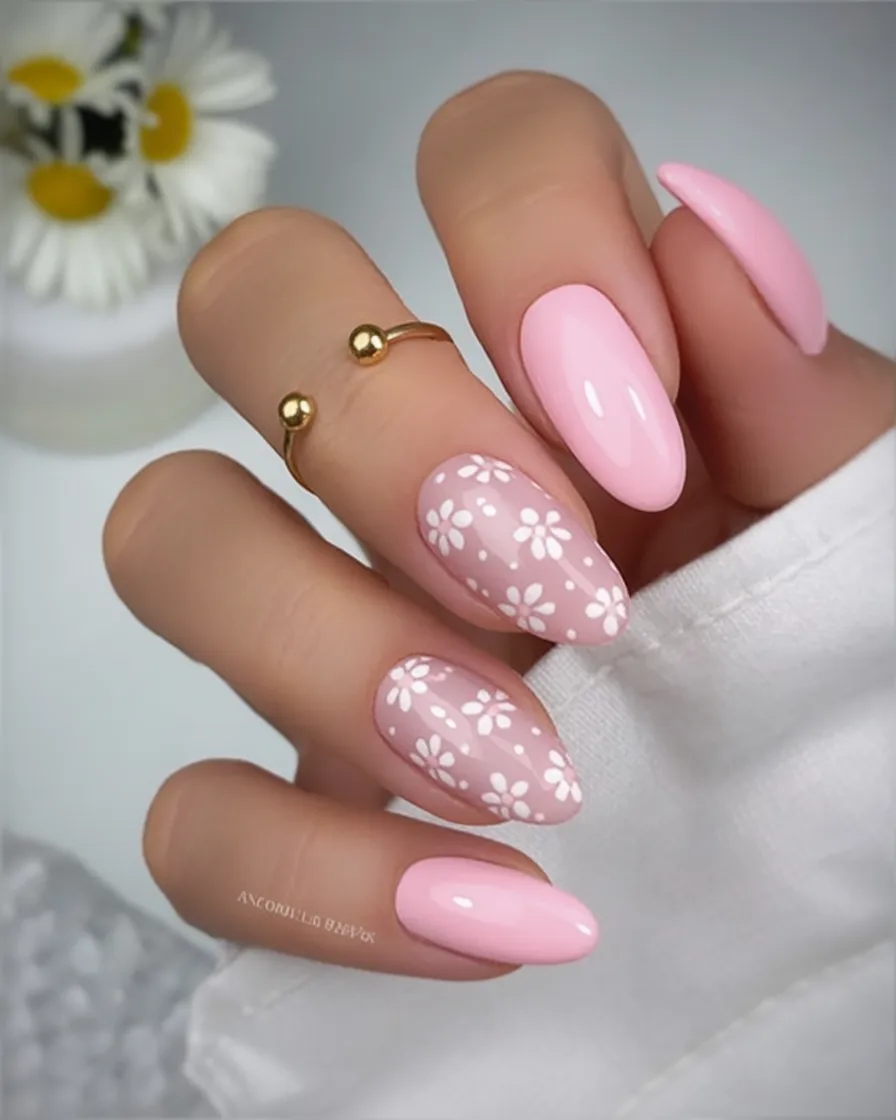 This soft pink base covered in tiny white Flower details and delicate dots feels so feminine and fresh. It’s romantic without being overly sweet—just that perfect spring balance. The look feels light, airy, and quietly elegant.