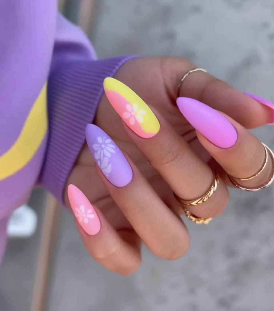 If you’ve ever wanted your nails to feel like a spring mood board, this is it. Soft purple, pink, and yellow blend together in a dreamy Ombre effect, while delicate Flower details float across the surface like pressed petals. It’s playful, feminine, and a little bit nostalgic—the kind of manicure that makes you smile every time you reach for your coffee.