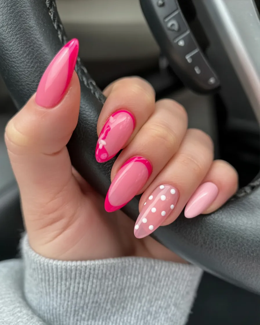 If classic French tip nails had a bold spring makeover, this would be it. Vibrant pink edges frame a glossy blush base, while a playful polka dot accent adds personality. It’s flirty, confident, and just a little daring—the kind of manicure that feels right at home in 2026.