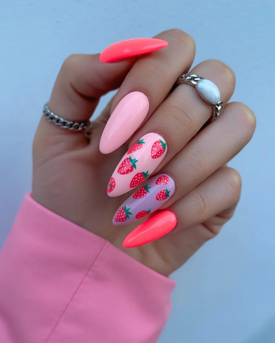 Now this is for the bold girls. Neon pink paired with tiny strawberry details feels playful, confident, and completely unapologetic. The mix of bright and soft pink keeps it balanced, but there’s no denying this manicure wants attention—and honestly, I love that.