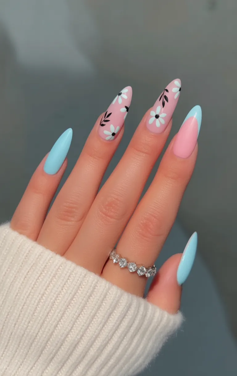 There’s something so effortlessly chic about mixing baby blue with soft pink. Add a few graphic white Flower accents and suddenly the whole look feels fresh, modern, and just a little flirty. These almond nails feel like the perfect weekend manicure—relaxed but still totally put together.