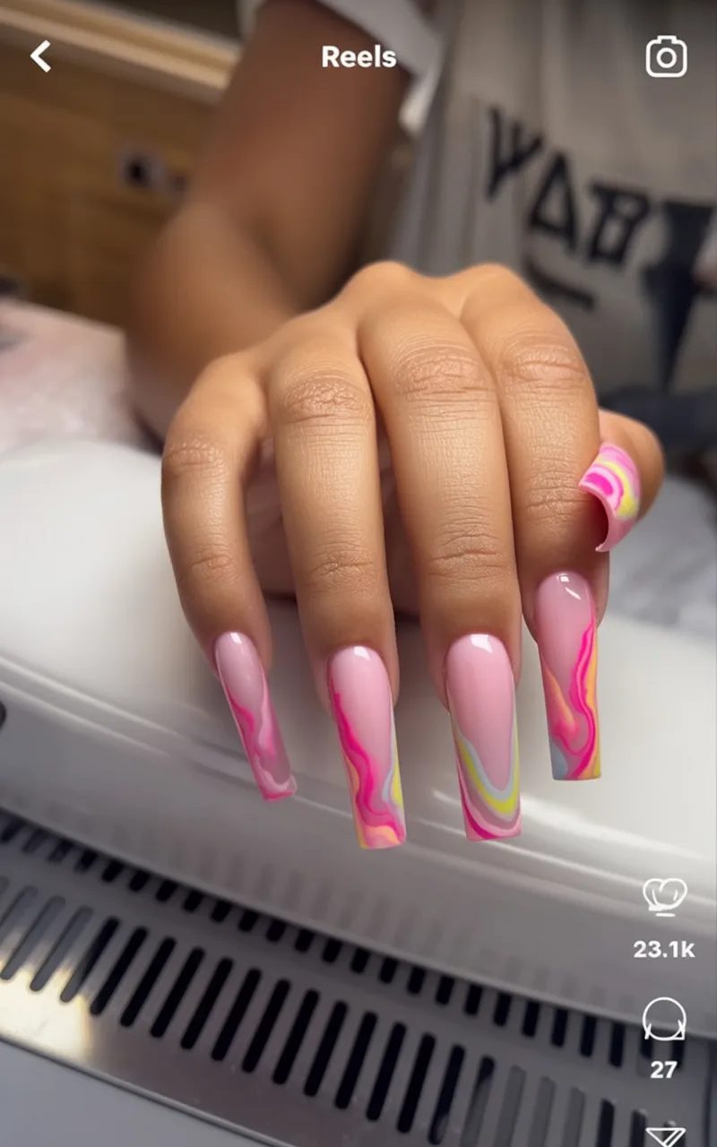 These long coffin nails feel glamorous but still playful thanks to the pink marble effect. Swirls of soft pink, yellow, and subtle accents create a flowing design that feels almost like wearable Art. It’s bold, feminine, and made to be noticed.