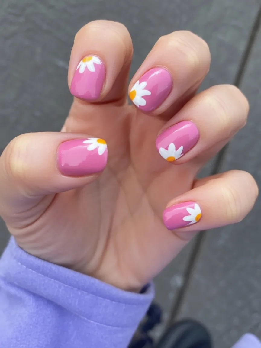 These short pink nails with simple white daisies feel effortlessly sweet. There’s something about a clean pink base and bold Flower accents that just screams spring in the best way. It’s fresh, youthful, and completely wearable—no drama, just charm.