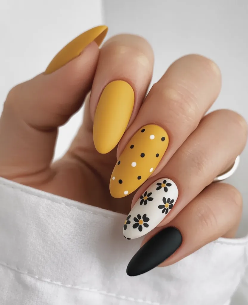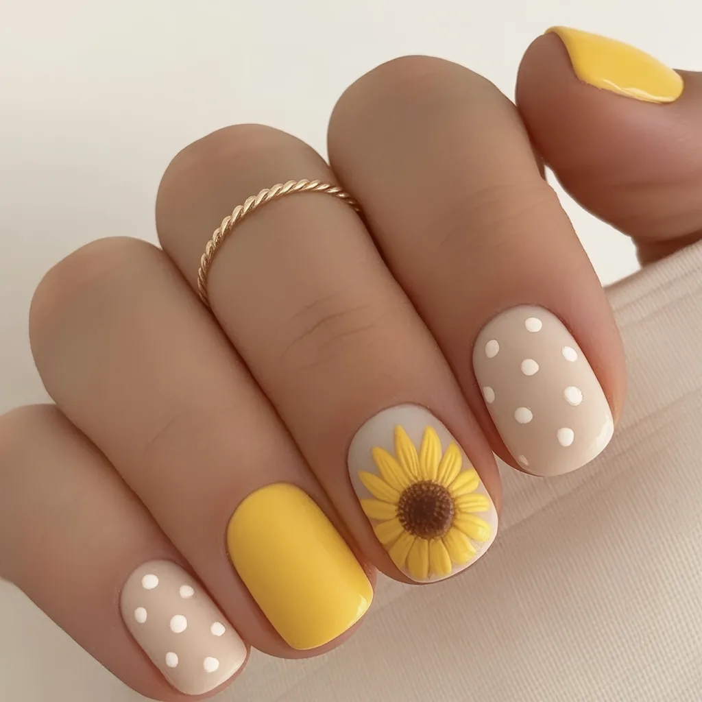 This manicure feels like a warm afternoon in full bloom. The rich yellow paired with creamy neutrals and playful polka dots gives off such happy energy. And that detailed Flower accent? It’s pure spring joy, but done in a way that feels stylish rather than over-the-top.