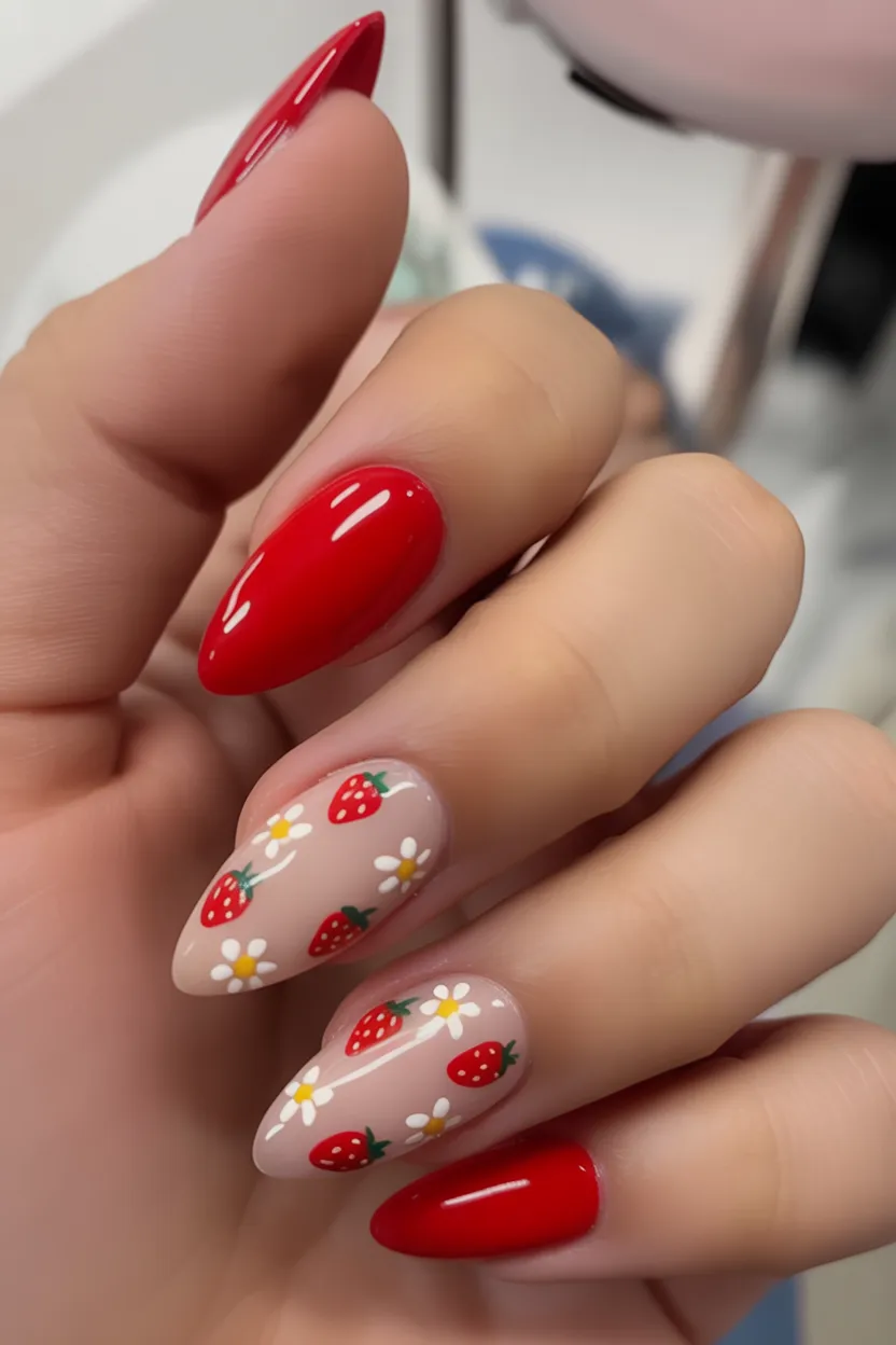 There’s something timeless about bold Red in spring—it’s confident, a little flirty, and always chic. Paired with tiny strawberry Art and daisy details, this manicure feels playful but still grown-up. It’s the kind of design that makes you feel instantly put together, even if you’re just wearing jeans and a tee.