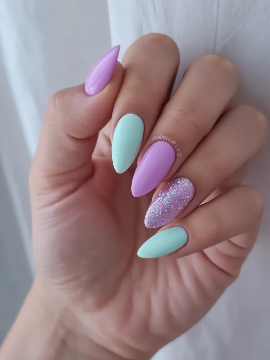 Mint green and soft purple together always feel like spring in full color. Add a glitter accent nail, and suddenly the whole look feels playful and light-catching. It’s fun without being flashy—just the right amount of sparkle to lift your mood.