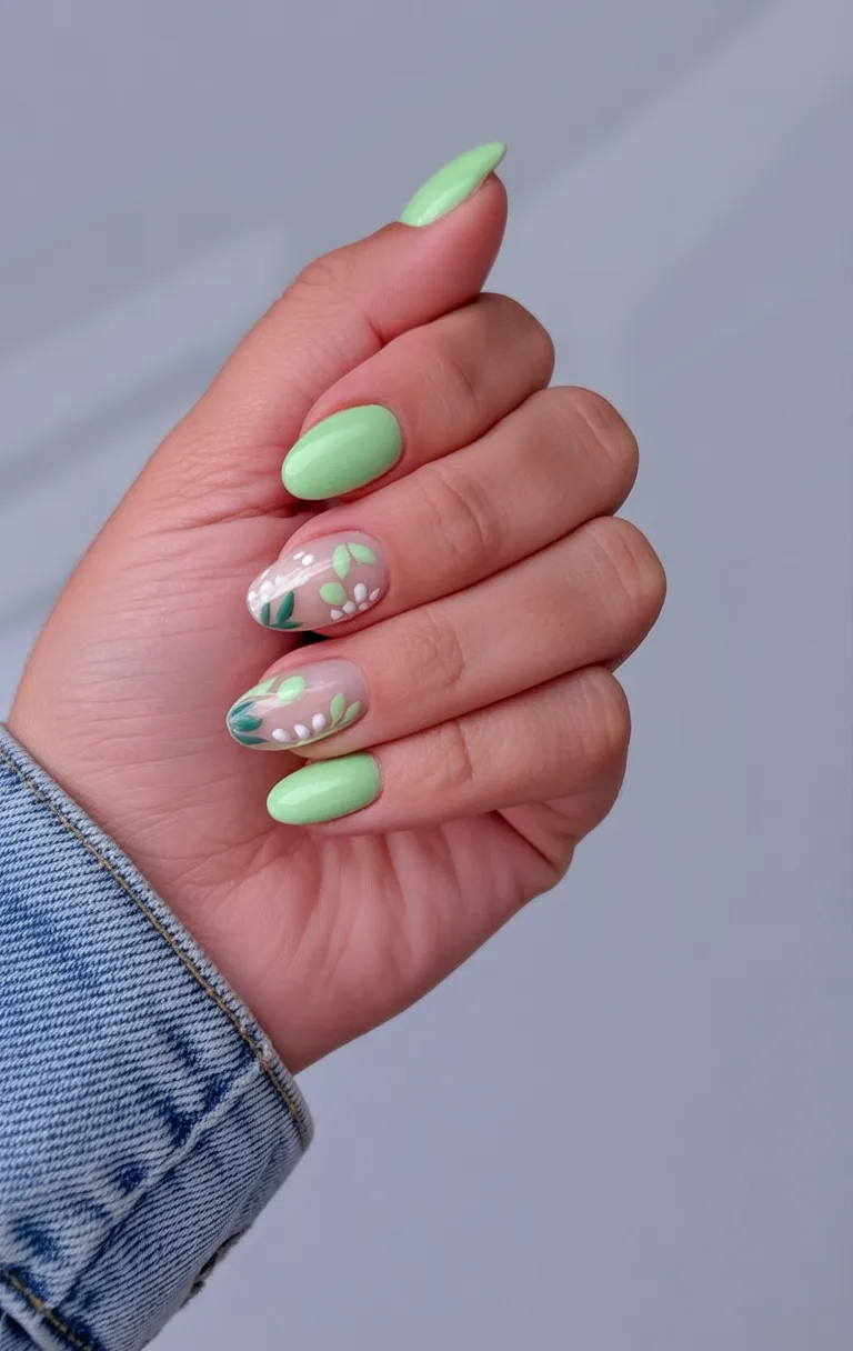 This soft green manicure feels calm and grounded, like fresh leaves after rain. The delicate white and leafy Art adds a gentle, organic touch that feels peaceful and modern at the same time. It’s subtle but still special—the kind of design that quietly stands out.