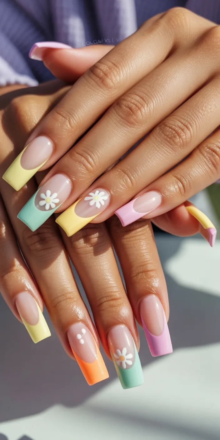 These pastel square nails are pure spring happiness. Soft yellow, mint green, lilac, and peach tips create a playful rainbow, while tiny white Flower accents keep everything sweet and balanced. It’s colorful without feeling chaotic—just the right mix of fun and polish.