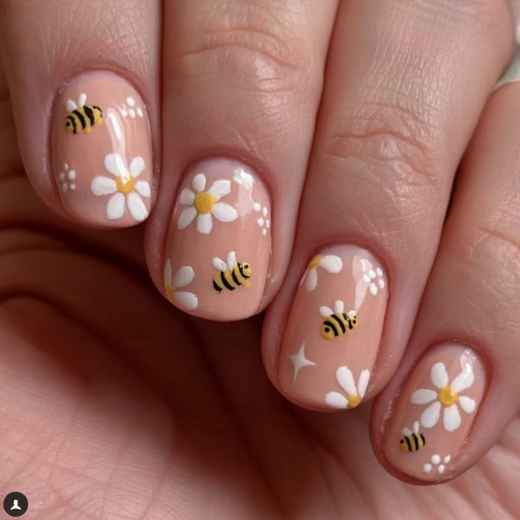 The bees are buzzing, and we’re obsessed. This natural nude base decorated with daisies and honeybees is about as cute and pretty as it gets. It’s ideal for round nail lovers who want a simple, wearable design that still has personality. It’s also super easy to DIY or request at your favorite salon. Rock it with a linen jumpsuit, straw hat, and woven sandals for that effortless, modern countryside aesthetic.