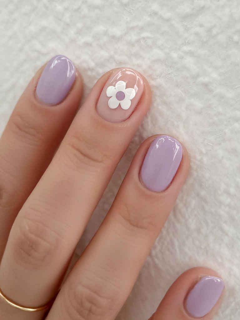 Here’s a perfect example of how simple can still be stunning. This soft lavender set, done in a gel finish, features a single nail with a minimalist white flower and lilac center on a clear base—subtle yet impactful. The round shape adds to the natural charm, making this style perfect for everyday wear with a twist. It’s a go-to if you’re headed to a garden party or even just updating your workweek look. Match it with a linen blouse in neutral tones or a light purple sundress for an effortlessly cohesive outfit.