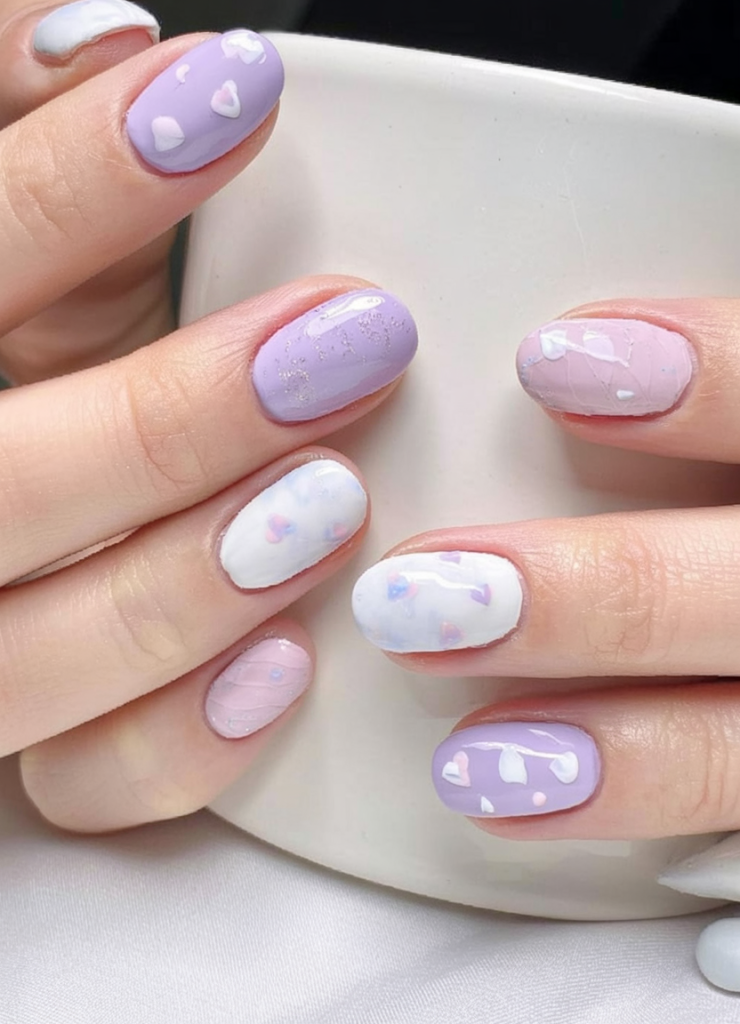 This look feels like a love letter to cotton candy skies and sweet summer nostalgia. Using a mix of purple, pink, and white, the design blends 3D hearts, sheer textures, and soft patterns across each nail. The almond-ish silhouette gives this design a romantic edge without being overly dramatic. This would be such a fun choice for a summer date night or a girl’s weekend getaway. Style it with a flowy white dress or pastel denim for an ultra-feminine finish that’s totally 2025.