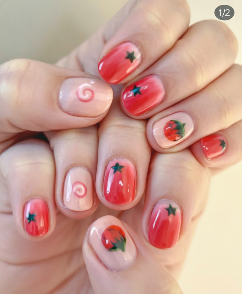 For a bold yet cheeky statement, this strawberry-inspired set brings major personality. Featuring juicy red gel fades, green stems, and whimsical swirls, this round style is both artsy and fruit-forward. It’s one of the more fun and expressive looks in this list—ideal for farmer’s market days or beach picnics. Throw on a cherry red headband, high-waisted denim shorts, and a cropped graphic tee to embrace the quirky Western flair.