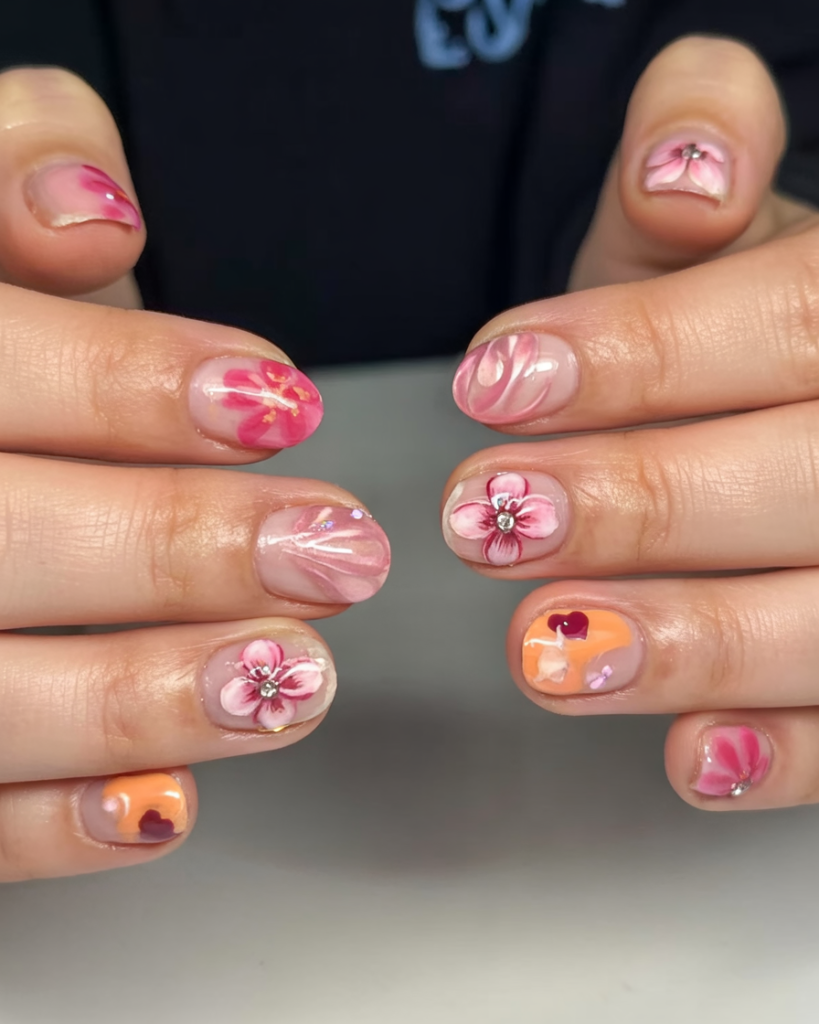 This bright and vibrant floral set is like a tropical cocktail for your fingertips. Featuring hand-painted flowers with gem centers and swirled abstract backgrounds in shades of pink, orange, and white, this one is for the bold and artistic at heart. The short, softly square style lets the artwork take center stage while remaining totally wearable. Pair this mani with a citrus-toned outfit and statement earrings for a vacation-ready moment—even if you’re staying local.
