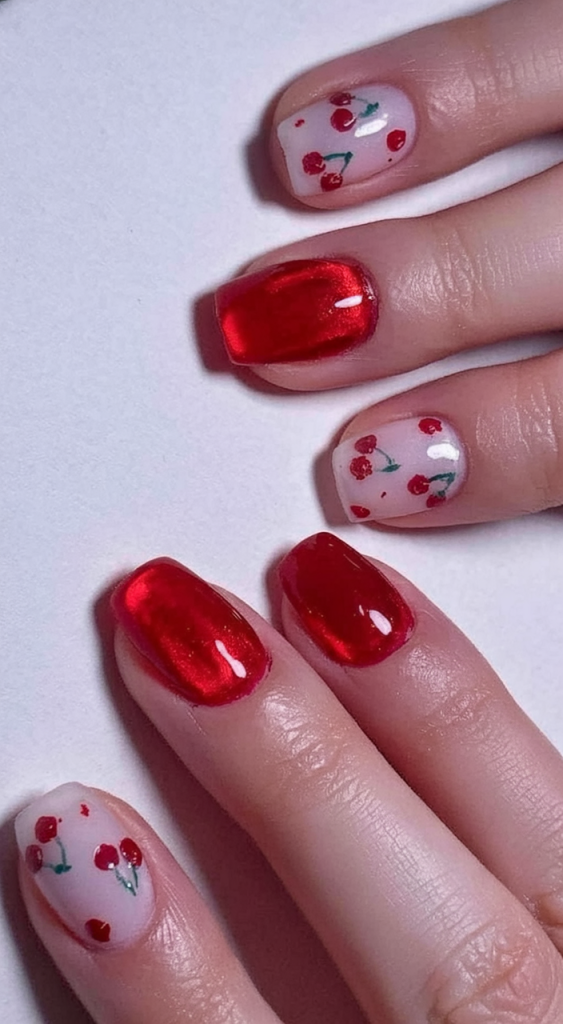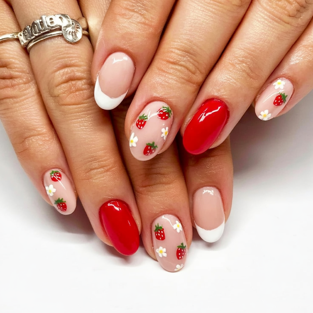 Summer 2025 is clearly the year of the berry, and this look takes it to cottagecore heaven. Tiny strawberries paired with white daisies and glossy red and white accent nails create a cute, wholesome aesthetic. The almond shape gives it a soft and flirty feel, making it perfect for brunch or Sunday strolls. Style with a puff-sleeve dress, straw hat, and crossbody basket bag for an outfit that matches the vibe perfectly.