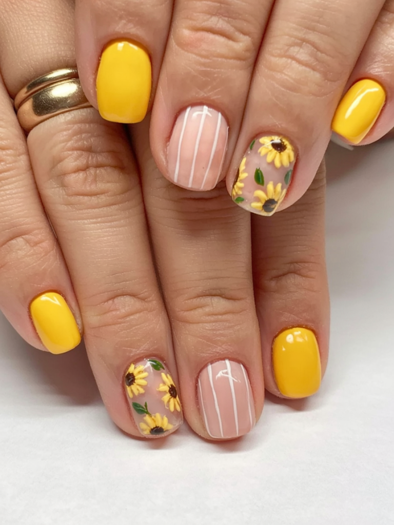 Nothing says “good morning, summer” quite like a sunflower manicure. These short, square nails combine bright yellow polish, delicate hand-painted flowers, and sheer pink bases with white vertical stripes. The design feels both cheerful and grounded—great for teachers, creatives, or anyone who wants to bring a little happiness to their fingertips. Wear it with a floral romper or a light denim jumpsuit to keep the sunny spirit going strong.